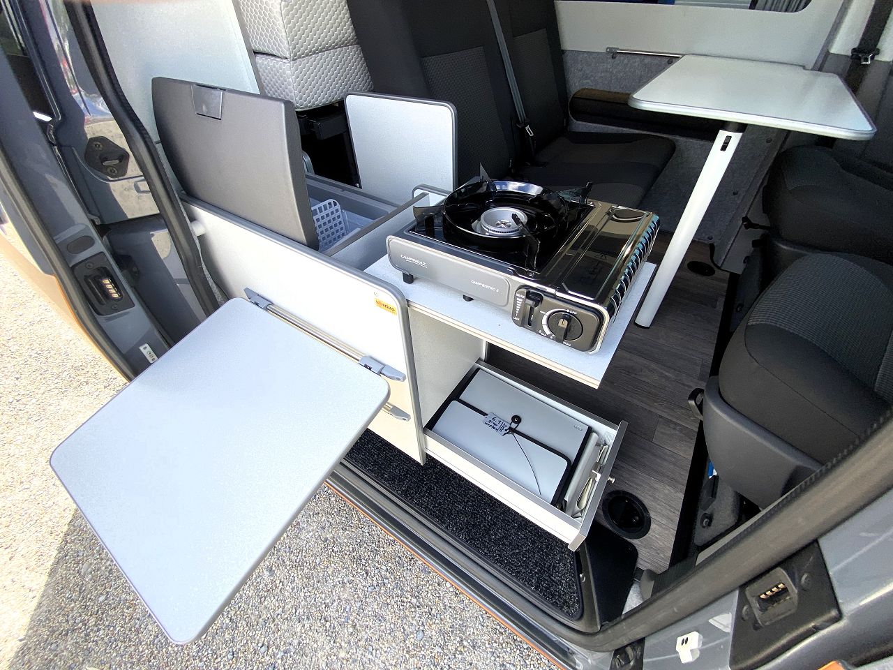 Küchenmodul "Cooky" - mit Kompressorkühlbox, Gaskartuschenkocher und Staulade - dazu eine ausklappbare Arbeitsfläche - und wie alles bei Bike n`Surf kann auch dieses Modul schnell ohne Werkzeug ausgebaut werden. Das Modul kann auch ohne Kocher und Kühlbox verwendet werden. -