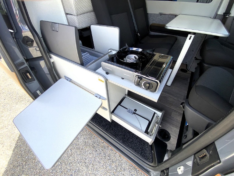 REIMO TRIOSTYLE - KUWOVANS BUS.2 Diese Variante ist vergleichbar mit dem VW California Ocean. Eine Möbelzeile mit Küche, Wasseranlage, Gasanlage, 12V und 230V Module, variable Schlafsitzbank mit 3 Sitzplätzen und 2 Schlafplätzen und ein Schlafdach - hier das Reimo EasyFit vorne hoch Zeltbalg standard -