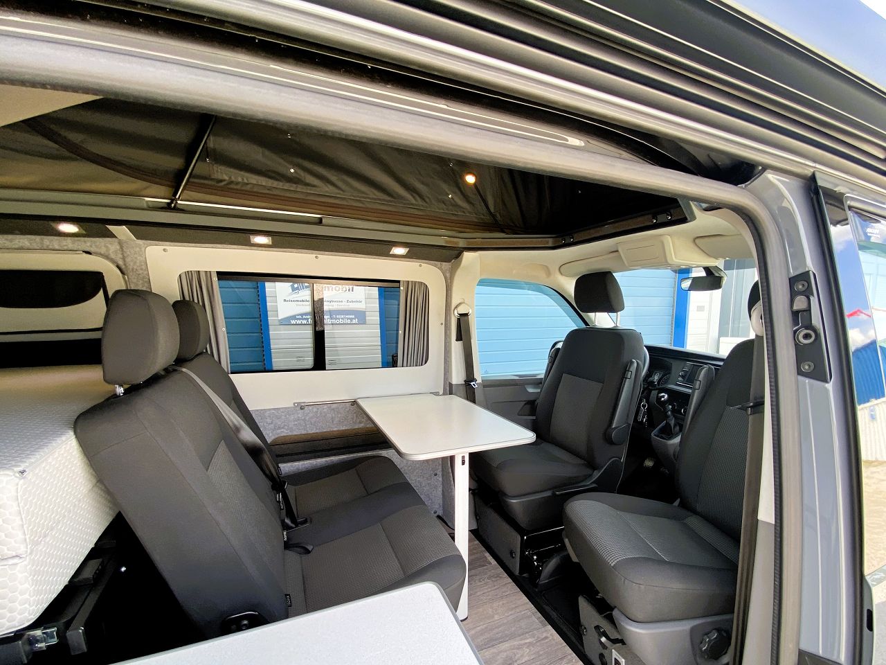 REIMO TRIOSTYLE - KUWOVANS BUS.2 Diese Variante ist vergleichbar mit dem VW California Ocean. Eine Möbelzeile mit Küche, Wasseranlage, Gasanlage, 12V und 230V Module, variable Schlafsitzbank mit 3 Sitzplätzen und 2 Schlafplätzen und ein Schlafdach - hier das Reimo EasyFit vorne hoch Zeltbalg standard -