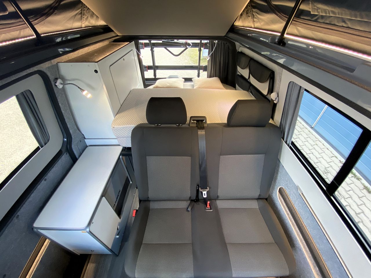 V3000 - BETTFUNKTION - Hier liegst Du auf der ebenen Rückseite der Sitzbank - die Breite beträgt bei diesem Ausbau 122 cm - mehr als im California. Ein Topper ist eine Option falls der Liefekomfort verändert werden soll. Das Aufklappen der Bank zum Bett dauert wenige Sekunden. -