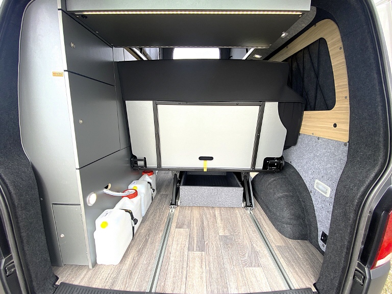 LADERAUM - unter dem Heckteil des Bettes bleibt viel Platz für Deine Reiseausrüstung. Auf Wunsch montieren wir gerne auch einen Schwerlastauszug für zB.: Euro Boxen