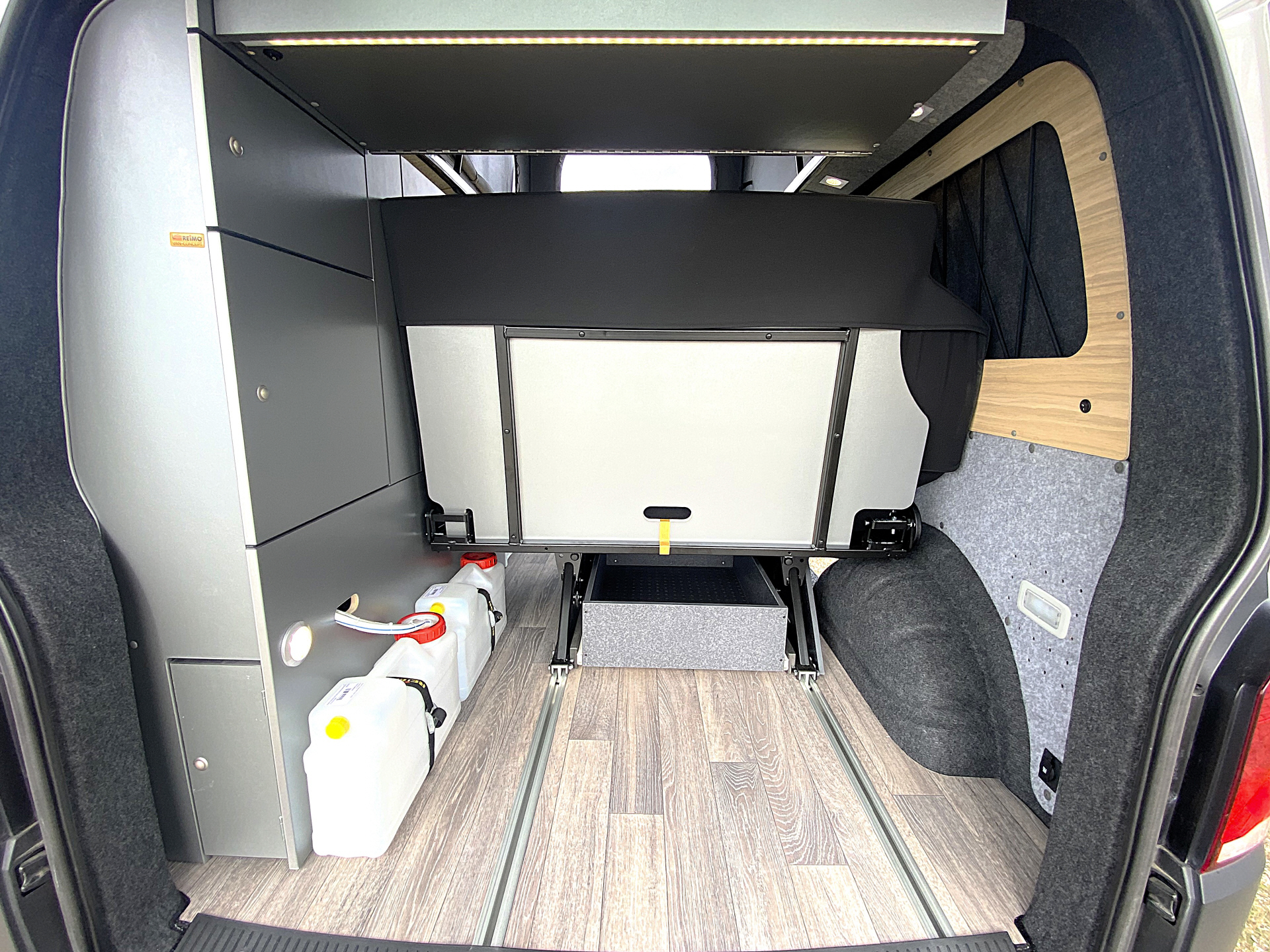 Das Raumkonzept - die wesentlichen Elemente sind aus dieser Perspektive sehr gut ersichtlich. Bank - Bett - Seitenschrank - Küchenbox "Cooky" - Taschenelement für die Aufbewahrung - und natürlich das tolle Reimo Schlafdach - geht aber auch ohne! -