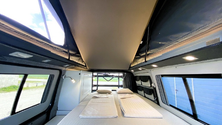 Und er ist ein echter Campingbus. 2 (+2 für Gäste) Schlafplätze, 2 Sitzplätze, 12V und 230V Stromversorgung, Kühlbox und Gaskocher, Diesel Standheizung, viel Stauraum und viel Platz und Bewegungsfreiheit.