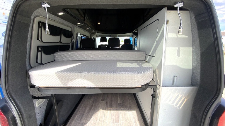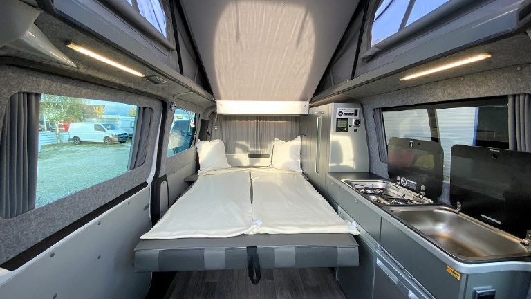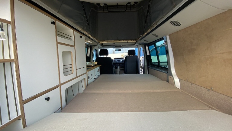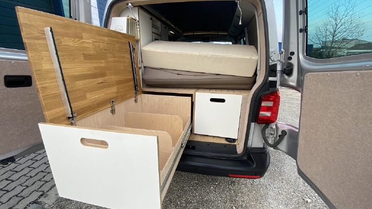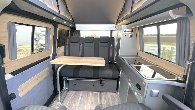 Und er ist ein echter Campingbus. 4 Schlafplätze, 4 Sitzplätze, 12V und 230V Stromversorgung, Kühlbox und Gaskocher, Diesel Standheizung, viel Stauraum und Platz für 4 Personen am Tisch.