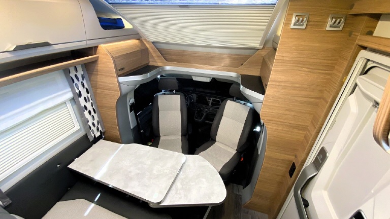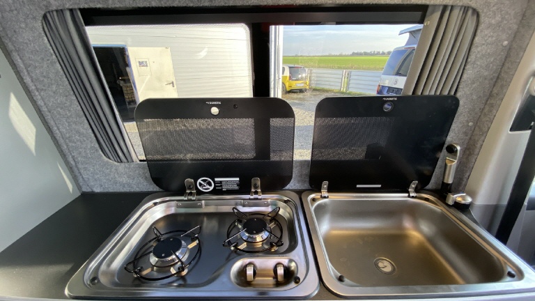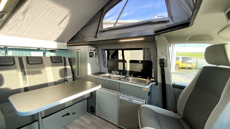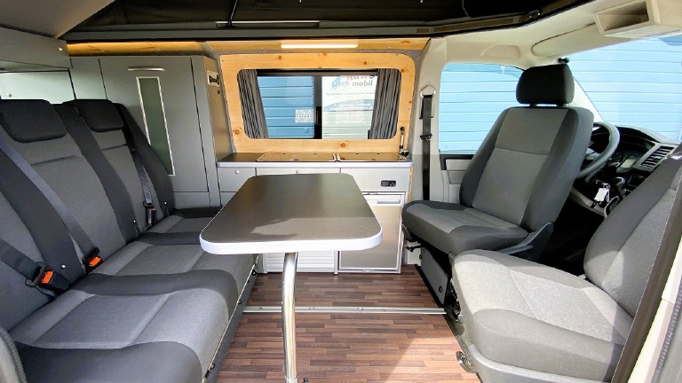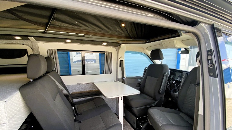 Und er ist ein echter Campingbus. 4 Schlafplätze, 5 Sitzplätze, 12V und 230V Stromversorgung, Kühlbox und Gaskocher, Gas Wohnraum- und Standheizung, viel Stauraum rundum und Platz für 4 Personen am Tisch.