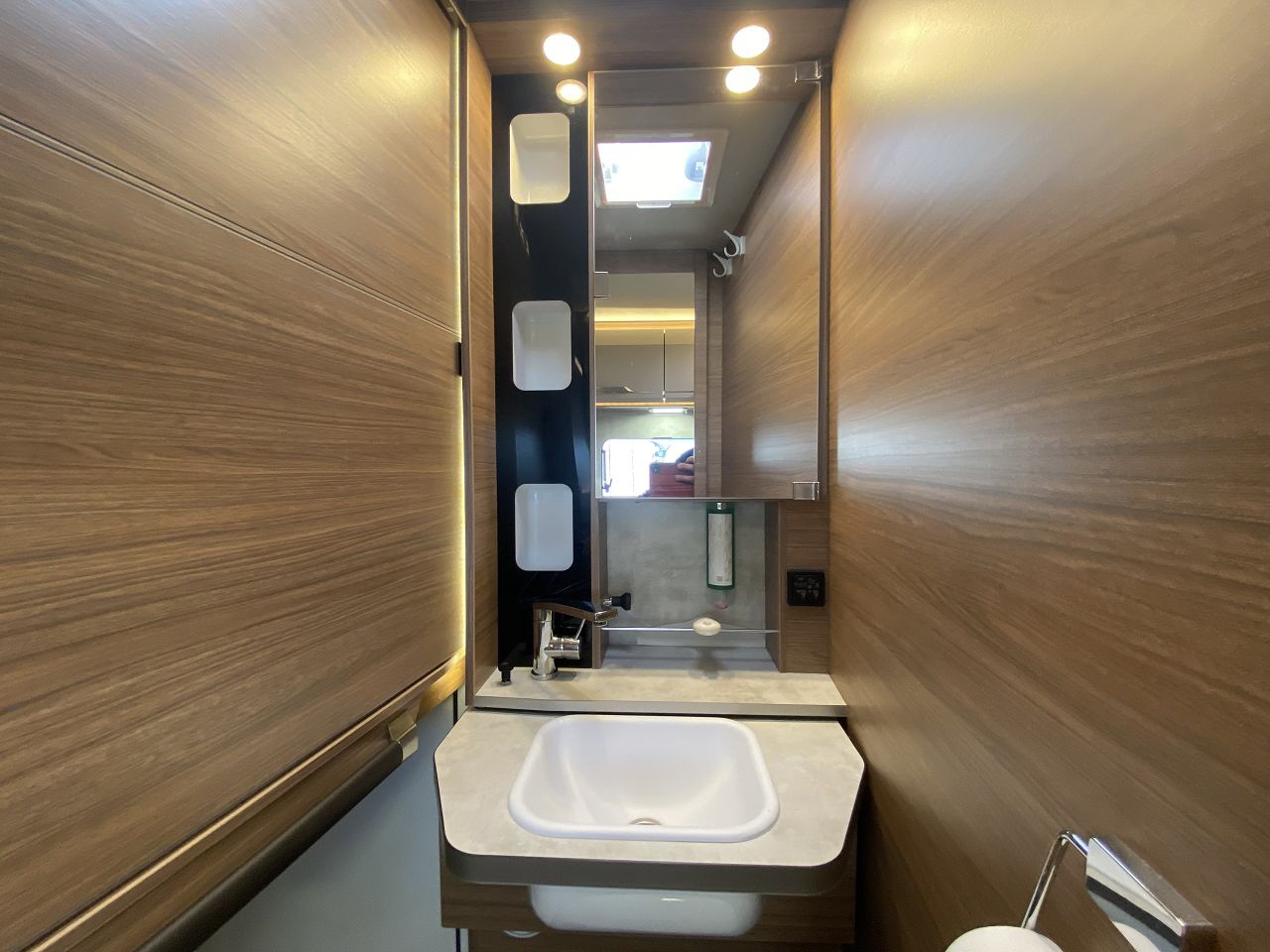 Xpand Bad mit Dusche, klappbaren Duschwänden, verschiebbares Waschbecken, THETFFORD Toilette mit Kassette 19L drehbar, Dachluke 28x28cm für gute Belüftung.