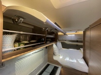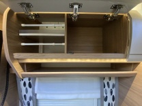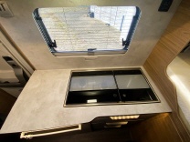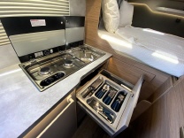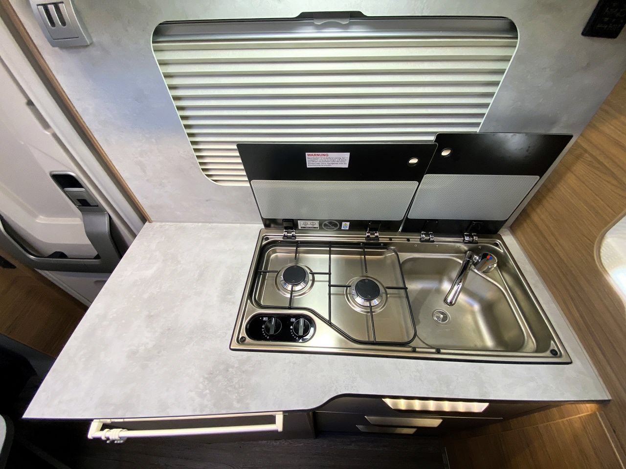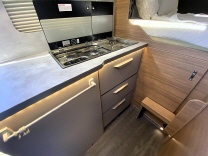 Küchenzeile mit Spüle, 2-flamm Kochfeld und 80L Kompressorkühlschrank, Staukästen oberhalb mit großen Klappen (selbstschliessend) und im Küchenblock, Laden (selbsteinziehend)